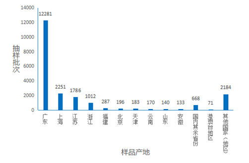 各省(区、市)化妆品抽样批次数量分布情况见图1。抽样主要采用现场抽样和网络抽样两种方式进行,抽样的地域分布情况见图2。样品的产地分布情况见图3。
